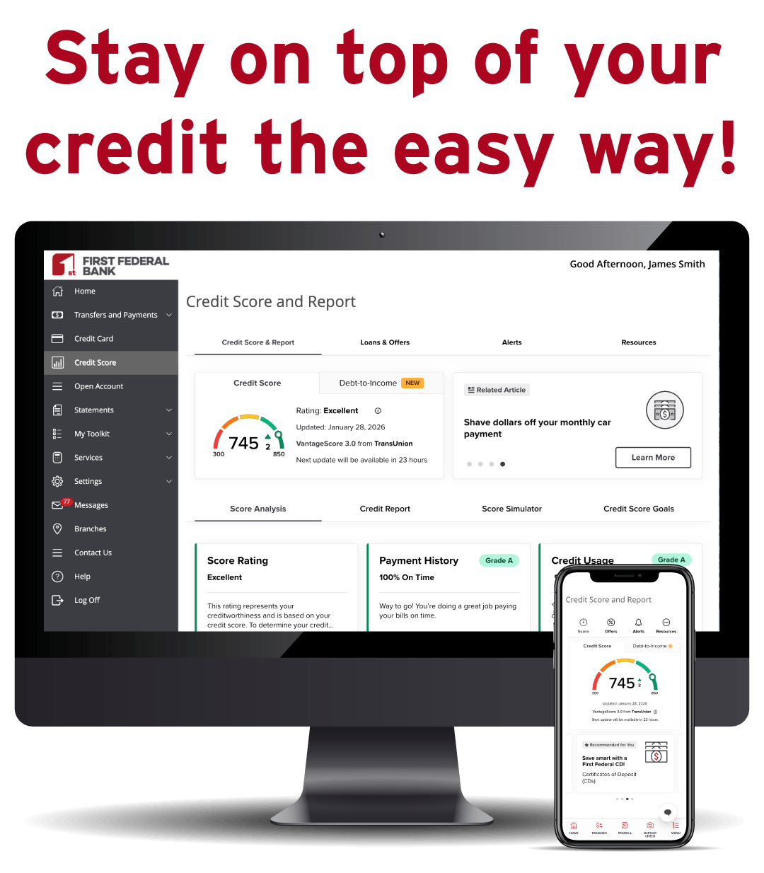 First Fed makes monitoring your credit easy and free using our Online Banking or mobile app!